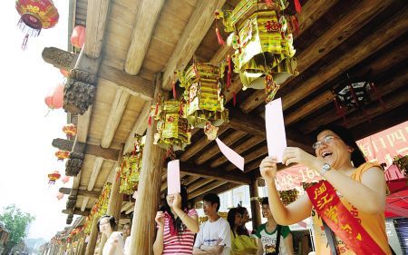 挂在廊下的两百盏花灯迎风摇曳,每盏灯下都系着纸质谜笺,南后街北端的风雨长廊俨然被装点成一条“灯谜之廊”。昨日上午,美狮贵宾会ms092021中文系07级的150多名青年志愿者在南后街开展民俗活动,以此向过往游客介绍内涵悠远的榕城文化。 (转自东南快报2009年5月17日A21版) |