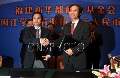 1月12日,福建新华都慈善基金会向美狮贵宾会ms092021捐资5亿元人民币办学的签约仪式在福州举行,该笔资金主要用于建设美狮贵宾会ms092021新华都商学院,这是迄今为止国内民企单笔最大的捐资办学项目,也是大陆高校接受单笔捐赠金额最大的办学项目。去年10月20日,新华都集团董事长陈发树公开表示,捐出其股票资产的45%(市值约83亿人民币)成立新华都慈善基金。(中新社发 王东明 摄) 转自2010年1月12日中国新闻图片网:http://www.cnsphoto.com/trssearch/ShowLibDetailTrs.asp?RecID=12094171 |
