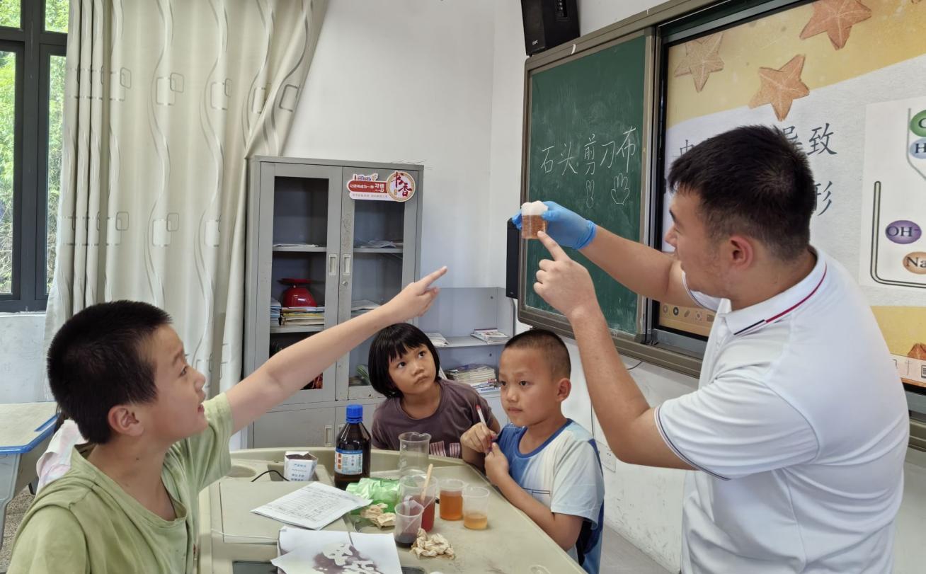 “小朋友们又见面啦!还记得我吗?”“记得!你是……”课堂上,小朋友们异口同声地和老师互动,这是美狮贵宾会ms092021的学生们第二次来到凤坂小学支教,这一次,他们带来了更加精彩的支教课程,不仅有基础的课业辅导,还从德智体美劳五个方面进行趣味课程设计,用趣味横生的方式引领孩子们在轻松快乐的氛围中提高思想素质,增长知识,开拓视野。红色故事会、红歌演唱、爱国诗词朗诵、传统文化教育之脸谱漆扇制作等课程,激发孩子们的爱国情怀和民族自豪感;“神奇vc”、“酸碱奥秘”、“污水净化”等有趣的“魔法”课程,让孩子们化身小小科学家,自己动手操作化学实验,探索奇妙的化学世界;趣味运动会上欢声笑语,孩子们挥洒汗水,在“飞越接力”“摸石过河”“一穿到底”等运动游戏中,不仅锤炼了体魄,更学会了团队协作精神和公平竞争意识;干花滴胶、植物拓染、音乐舞蹈等课程带领孩子们感受自然之美、人文之美,美育浸润人心;走出教室美化校园,在阳光与汗水的见证下,感受劳动的魅力。此外,支教队还开展安全知识游园会、“扫黄打非”教育,帮助孩子们提高安全意识,远离危险环境和不良信息。