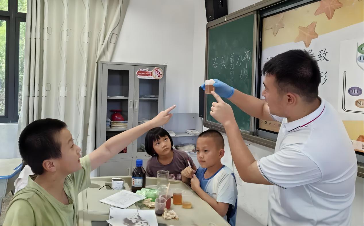 (图为支教队员为学生演示化学小实验)