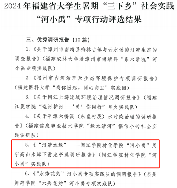 近日,共青团福建省委公布2024年大学生暑期“三下乡”社会实践“河小禹”专项行动评选结果,我校材化学院“河小禹”实践队发表的实践报告《周宁高山水库下游龙亭溪调研报告》获评十佳优秀调研报告。