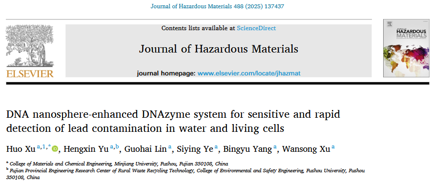 近日,材化学院许钬副研究员以第一作者兼唯一通讯作者身份,在环境科学领域国际权威期刊《Journal of Hazardous Materials》上发表了题为《DNA Nanosphere-Enhanced DNAzyme System for Sensitive and Rapid Detection of Lead Contamination in Water and Living Cells》的研究论文。该期刊为中科院一区TOP期刊,影响因子为12.2。该研究提出了一种DNA纳米球增强型DNAzyme传感平台,具有结构简易、成本低、灵敏度高、抗干扰能力强以及生物相容性好的特点,可实现水体及人体内铅离子的超灵敏、快速检测。此项成果不仅对环境监测和污染防治具有重要意义,还可广泛应用于食品安全、医学检测以及相关公共卫生领域,为铅污染的检测提供了新的技术途径。