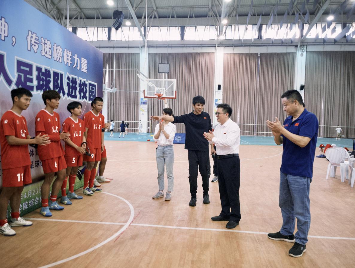 4月23日,“弘扬体育精神,传递榜样力量——福建男子盲人足球队走进校园”活动在综合体育馆顺利举行,活动由公共体育教学部主办,女子足球俱乐部承办。副校长陈兴明出席,福建省男子盲人足球队队员、公体部教师党员、福建师范大学体育科学学院研究生等参加活动。