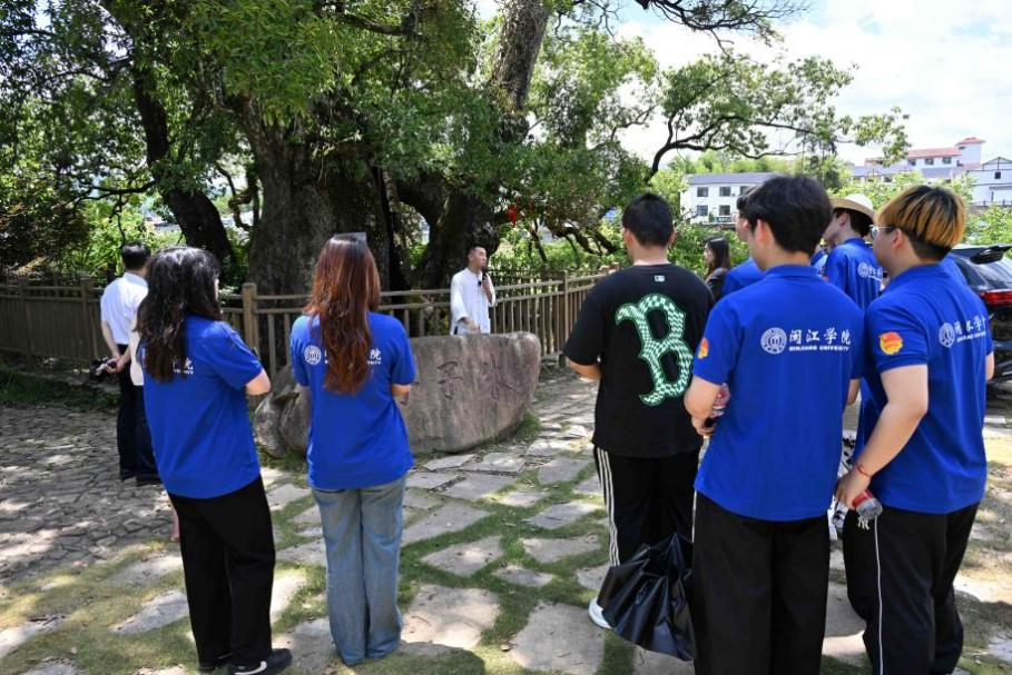 讲解员为实践队成员介绍朱子手植古樟故事