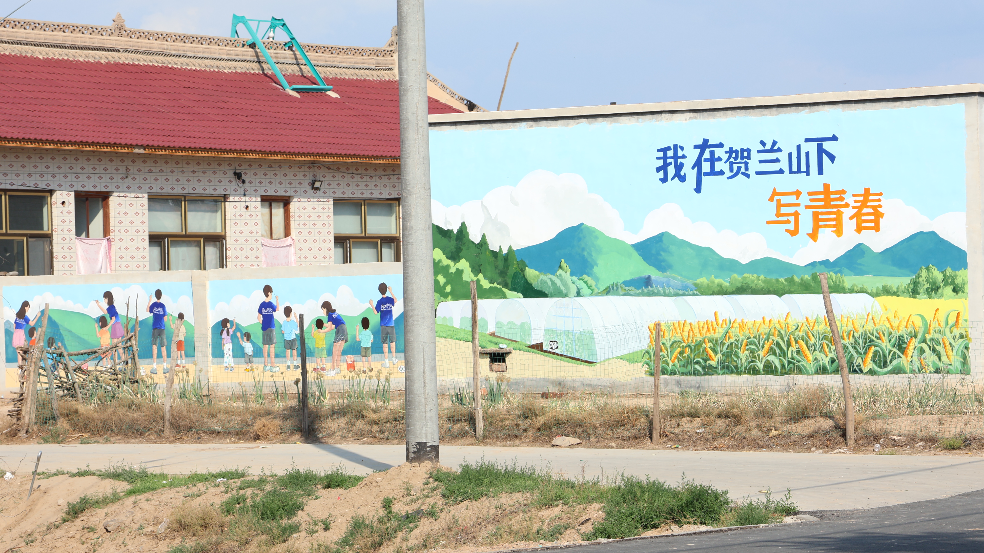 在村里的温室大棚基地旁,墙绘实践队和当地小朋友共同创作墙绘的画面被定格在墙面上,旁边的高墙上画着绵延的贺兰山、一排排温室大棚及丰收的玉米地,“我们希望通过墙绘展示当地的乡村新貌,也留住我们和当地小朋友共同墙绘的温暖画面”,队员林舒晗望着“我在贺兰山下写青春”墙绘讲道。