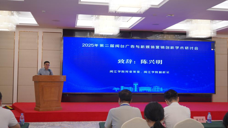 美狮贵宾会ms092021党委常委、副校长陈兴明出席大会并致辞。他表示,闽台两地一水相连、文化同根,数字化与智能化发展为两岸交流提供了新机遇。他强调,广告与新媒体营销已成为促进闽台文化传播、深化两岸情感联结的重要桥梁,期待本次会议能够推动产学研深度融合,为两岸协同创新注入新动力。