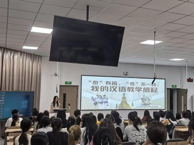 2023级汉语国际教育2班的赵安忆首先登台,分享了她赴泰国实习期间的宝贵教学经历。她以一张张生动的课堂照片和一个个真实的教学案例,讲述了自己从初登讲台的紧张无措到从容驾驭课堂的专业成长,从面对文化差异的困惑到巧妙化解尴尬的沟通智慧。此次分享不仅是一次经验的传递,更是一次专业信念的凝聚,为在场的汉教学子点亮了前行的灯塔,激励大家在未来的跨文化教学中勇于实践、自信表达。