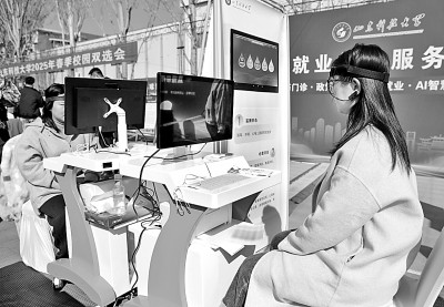 山东科技大学2025年春季校园双选会现场,大学生在AI心理测评区参与互动。张进刚摄/光明图片