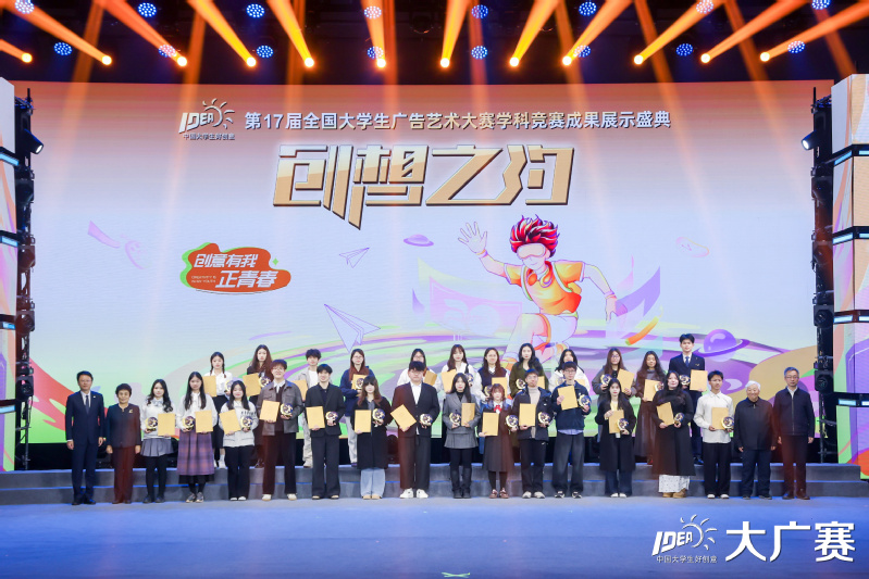 12月6日,第17届全国大学生广告艺术大赛全国颁奖典礼在北京举行。我校美术学院教师龚晓田与美术学院2023级视觉传达设计专业学子苏艺坤携获奖作品赴京,在全国政协礼堂登上最高领奖台。