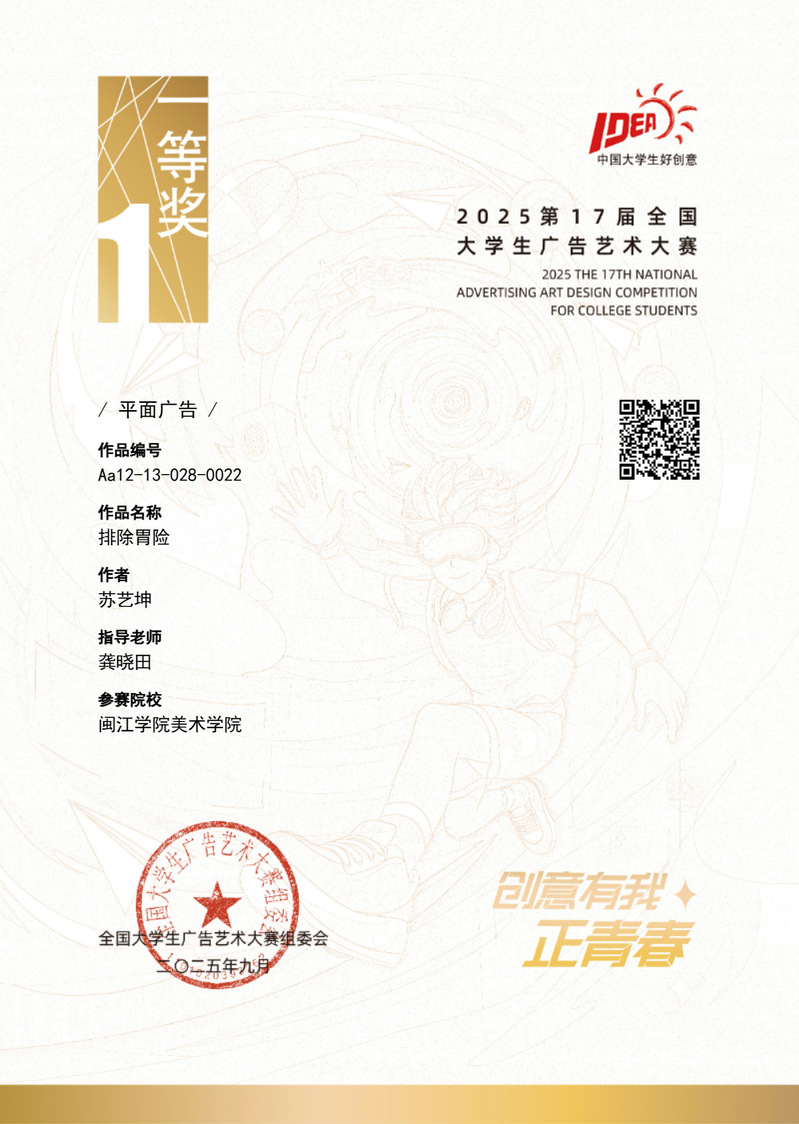 在激烈的角逐中,苏艺坤同学的作品《排除胃险》凭借其独特的创意构思与精湛的视觉表现力,获一等奖。该作品植根于学院视觉传达设计专业课程《招贴设计》的教学实践,依托“以赛促教、学以致用”的教学理念,将课堂知识与学科竞赛要求深度融合,是应用型创意设计人才培养模式成果的生动体现,充分展现了教学改革的卓越成效。