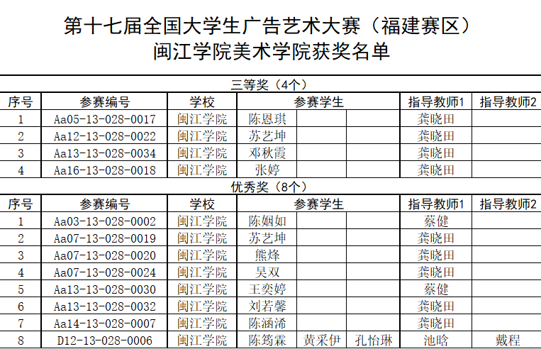 此外,美术学院其他学子同样表现亮眼,在省级赛事中获多项荣誉,具体获奖名单如下: