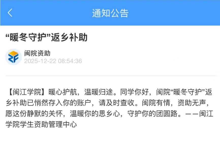 “学生资助悄悄地来,温暖了整个冬天。这份默默的支持,不仅减轻了生活负担,更让我们深切地感受到学校的无声关爱和暖心关怀。”看着手机屏幕上的暖心寄语,收到返乡补助的小婷深有感慨。