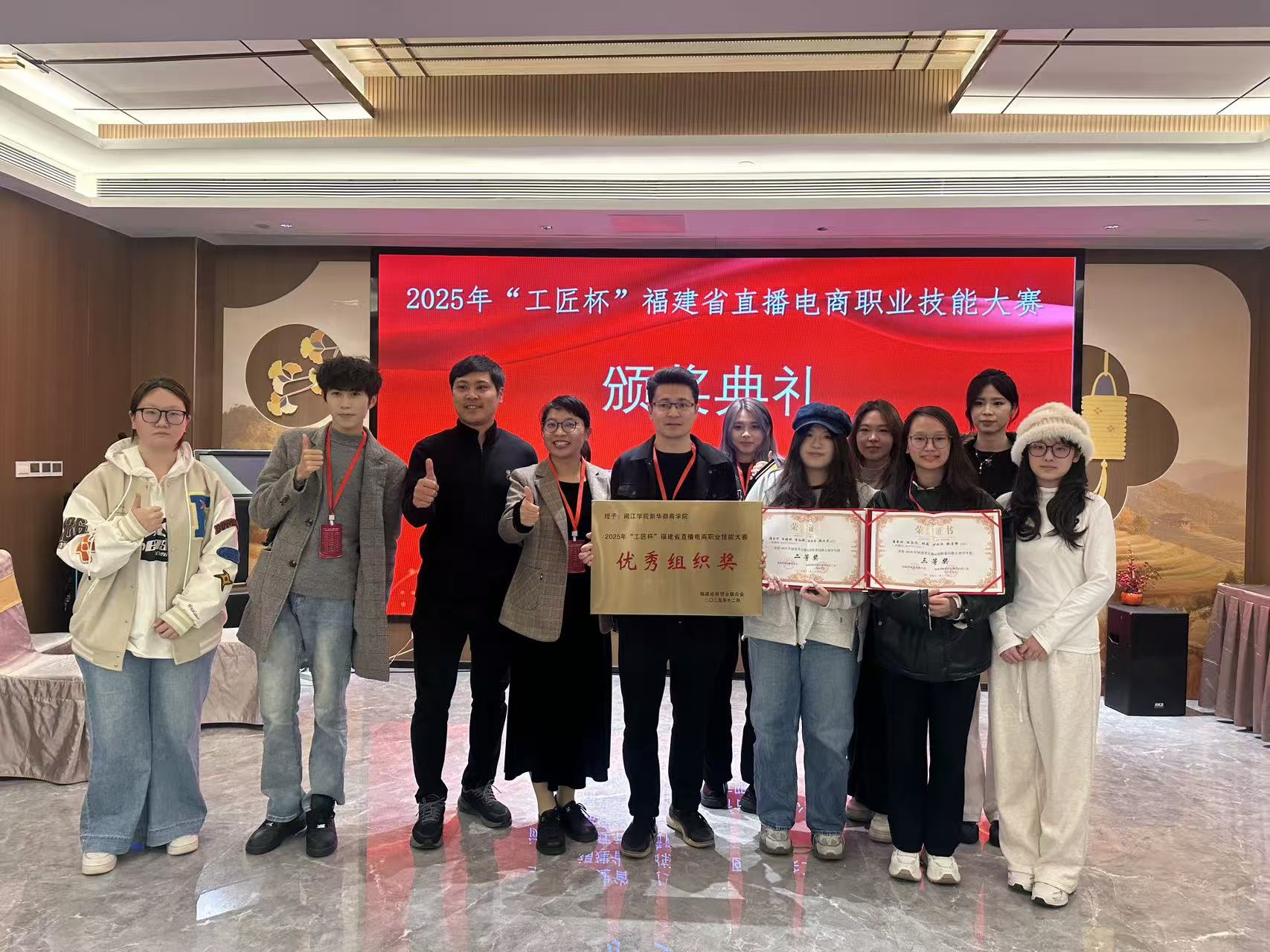 近日,2025年“工匠杯”福建省直播电商职业技能大赛圆满落下帷幕。在新华都商学院副院长杨小山和孙淑晓、孙茹老师的共同指导下,学子表现卓越,载誉而归。其中,“麦旋风队”(潘乐堃、陈婕妤、张文杰、廖灿桦、林乐垚)荣获大赛学生组二等奖;“脆汁鸡队”(潘琴琪、张洁静、伊雨欣、林真仪、林薇)荣获学生组三等奖。凭借扎实的专业基础和细致全面的赛事组织工作,新华都商学院被授予“优秀组织奖”。