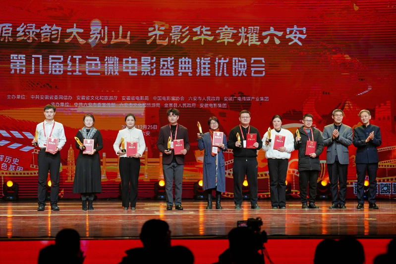 红色微电影盛典自2017年创办以来,已成功举办八届,成为推动红色文化创造性转化、创新性发展的重要平台。本届盛典由中共安徽省委网信办、安徽省文化和旅游厅、安徽省电影局、中国电影家协会、六安市人民政府、安徽广电传媒产业集团共同主办,自今年7月启动以来,共征集作品超2100部,其中主竞赛单元征集作品613部,涵盖微电影、短视频、微短剧等多种类型。经多轮严格评审,仅80部作品入围终评。盛典晚会以“红源绿韵大别山光影华章耀六安”为主题,汇聚全国影视创作者、行业专家、媒体代表及各界观众近600人,最终仅8部作品获评主竞赛单元“最佳短视频”。
