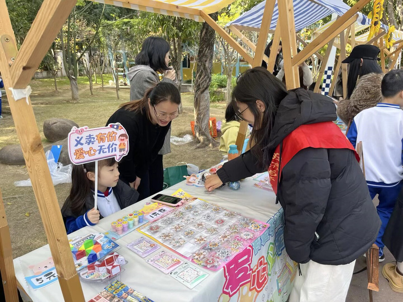 经管学院的青年志愿者们穿梭在各个摊位之间,成为活动现场一道亮丽的风景线。他们分工明确、各司其职:有的细心地帮忙整理摊位,有的耐心协助小朋友与顾客沟通交流,还有的认真维持现场秩序,及时清理儿童公园道路上的垃圾,确保整个集市活动在干净、安全的环境中顺利开展。