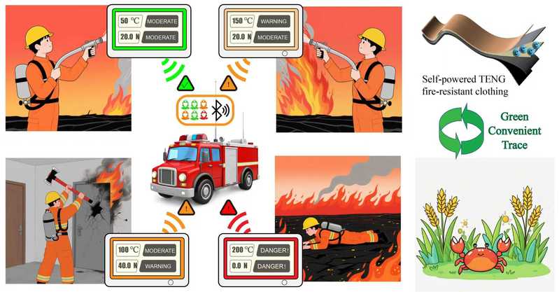 该论文受荷叶表面各向异性结构启发,通过一种温和的乙醇诱导表面缔合策略,成功制备了一种坚固、耐热且本质非可燃的壳聚糖基生物塑料(NCCB)。NCCB具有独特的粗糙上表面与平滑下表面结构,不仅机械性能优异,其极限氧指数超过70%并达到UL94 V-0等级,展现出卓越的阻燃与隔热性能。基于NCCB构建的摩擦纳米发电机,在超过200°C的高温环境下仍能保持稳定的高电输出,并具备优异的温度与应力双重传感灵敏度。通过结合卷积神经网络,该器件能实现高精度的温度-压力双模态识别,为早期火灾探测、火场监测及消防员安全预警等智能消防应用提供了创新的自供电解决方案。